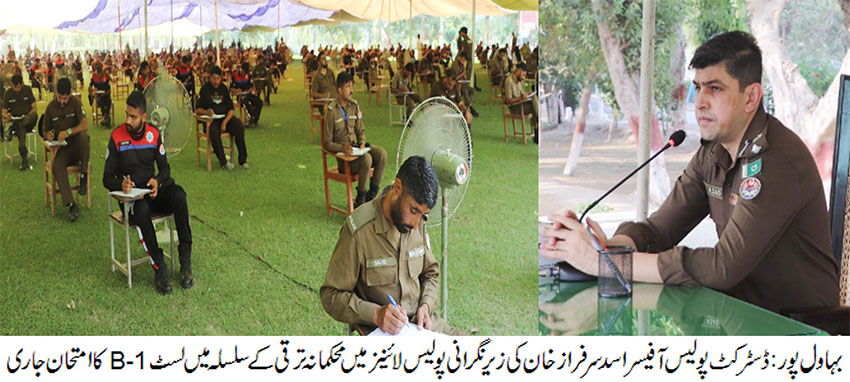 تفصیل کے مطابق ڈی پی او بہاول پور اسد سرفرازخان کی سرپرستی میں پولیس لائنز میں محکمانہ ترقی کے سلسلہ میں لسٹ B-1کے امتحان کا انعقاد کیا گیا۔امتحان میں ضلع بھر سے کنسٹیبلز اور لیڈی کانسٹیبلز نے شرکت کی ۔ تمام جوان اپنی ترقی کے لیے انتہائی پرجوش اور مکمل تیاری کے ساتھ آئے ہوئے تھے۔لسٹ B-1کا امتحان اس لیے بھی اہمیت کا حامل ہے کہ محکمہ میں مسلسل ترقی کی طرف پہلا قدم ہوتا ہے۔ امتحان کے تمام مراحل کی ڈی پی او بہاولپور نے بذات خود نگرانی کی ۔ ڈی پی اواسد سرفرازخان نے اس حوالے سے بات کرتے ہوئے کہا کہ ترقی کے اس عمل میں 100فیصد میرٹ کو مدنظر رکھا جائے گا۔ محنتی اور میرٹ پر پورا اترنے والے جوان ہی ترقی کے اہل ہوں گے۔امتحان میں شفافیت اورمیرٹ کو یقینی بنانے کے لیے تمام عمل کی بذریعہCCTV کیمرہ جات مانیٹرنگ کی گئی۔ ترقی کے عمل سے جوانوں کا مورال بلند ہوتا ہے۔ سکیورٹی خدشات کے پیش نظر پولیس لائنز میں سکیورٹی کے فول پروف انتظامات کیے گئے۔اس موقع پر ڈی ایس پی ہیڈ کوارٹر زبیر بنگش، ڈی ایس پی لیگل Iعبدالرئوف جاوید، ڈی ایس پی لیگل II جام محمد محسن اور دیگر متعلقہ افسران بھی موجود تھے۔