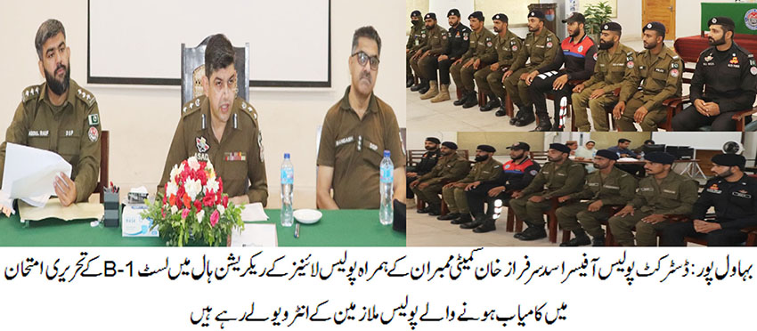 بہاول پور( )ڈسٹرکٹ پولیس آفیسر اسد سرفرازخان کی زیر قیادت پولیس لائینز کے ریکریشن ہال میں B-1 کے تحریری امتحا ن میں کامیاب ہونے والے امیدواروں کے ا نٹرویوزکا انعقاد کیا گیا۔کسی کی حق تلفی نہیں ہوگی،میرٹ کو یقینی بنایا جائے گا ۔ ڈی پی او اسد سرفرازخان