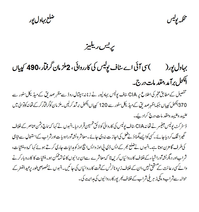 سی آئی اے اسٹاف پولیس کی کاروائی ، 490 کُپیاں الکحل برآمد ، 2ملزمان گرفتار ، مقدمات درج