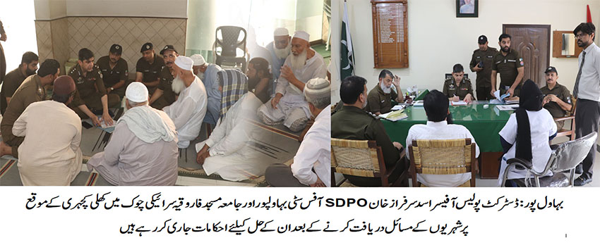 تفصیل کے مطابق انسپکٹر جنرل آف پولیس پنجاب کے ویژن انصاف آپ کی دہلیز پر کے پیش نظر ڈی پی اواسد سرفراز خان نے SDPO آفس سٹی بہاولپور اور جامعہ مسجد فاروقیہ تھانہ سول لائنز میں کھلی کچہری لگائی، جس میں اہل علاقہ کی کثیر تعداد نے شرکت کی۔ ڈی پی او کے ہمراہ ایس ڈی پی او سرکل سٹی بہاولپور، ایس ایچ اوزسٹی سرکل اور دیگر معزز شخصیات نے بھی شرکت کی ۔ڈی پی او اسد سرفراز خان نے کھلی کچہری میں تمام سائلین کو تفصیل سے سنا اور انفرادی طور پر متعلقہ افسران کو بروقت قانونی کارروائی اور واپسی رپورٹ کے احکامات جاری کیے۔ ڈی پی او نے کھلی کچہری میں شہریوں سے بات کرتے ہوئے کہا کہ تھانوں میں کھلی کچہری کا انقعاد ہماری اولین ترجیح ہے تاکہ شہریوں کے مسائل سن کر ان کی دہلیز پر بروقت دادرسی کی جاسکے۔ڈی پی اونے دوران کھلی کچہری افسران کو ہدایات جاری کرتے ہوئے کہاکہ میرٹ کو مقدم رکھتے ہوئے شہریوں کے مسائل تھانہ کی سطح پر ہی حل کیے جائیں جوکہ ہماری اولین ذمہ داری ہے۔ کھلی کچہری کا مقصد عوام کے مسائل کو ترجیحی بنیادوں پر حل کرنا اور عوام اور پولیس کے مابین فاصلے مٹانا ہے ۔ ایس ایچ اوز کو ہدایات جاری کرتے ہوئے کہا کہ عوام الناس کے ساتھ بہتر رویہ اپنائیں۔ عوام کی خدمت اور ان کے جان و مال کا تحفظ ہر صور یقینی بنایا جائے۔جبکہ شہریوں کا کہنا تھا کہ ہم بہت مطمئن ہیں کہ ڈسٹرکٹ پولیس آفیسر خود ہمارے مسائل کے حل کے لئے تشریف لائے اور مسائل کو فوری حل کرنے کے متعلق افسران کو حکم جاری کئے۔ ڈی پی او بہاولپور کے اس احسن اقدام سے انصاف کا بول بالا ہو رہا ہے۔ آخر میں ڈی پی او اسد سرفراز خان نے شہریوں کی شرکت پر بھی ان کا شکریہ ادا کیا۔