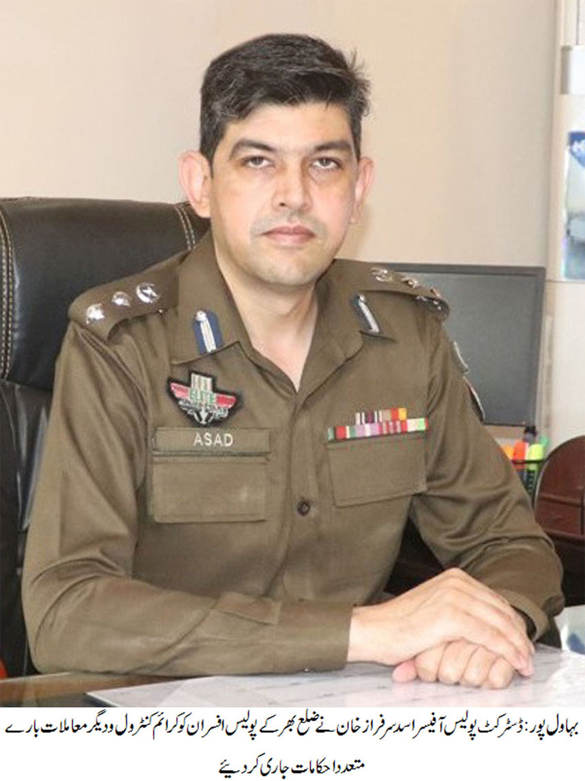 بہاولپور( )ڈسٹرکٹ پولیس آفیسراسد سرفرازخان نے ضلع بھر کے پولیس افسران کو متعدد احکامات جاری کر دئیے۔ پولیس آفیسران محنت اور جانفشانی سے اپنے کام کو یقینی بنائیں اور عوام الناس کے لئے اخلاقیات کا دائرہ کار وسیع کریں،اشتہاری ملزمان اور منشیات فروشوں کے خلاف کارروائیوں کو مزید تیز کیا جائے۔ شہری خدمت مراکز ، دفاتر اور پولیس اسٹیشن کے وزٹ کے بعد پولیس سروسز سے متعلق اپنا فیڈ بیک وہاں مہیا کردہ کیو آر کوڈ پر دیں، ڈی پی او