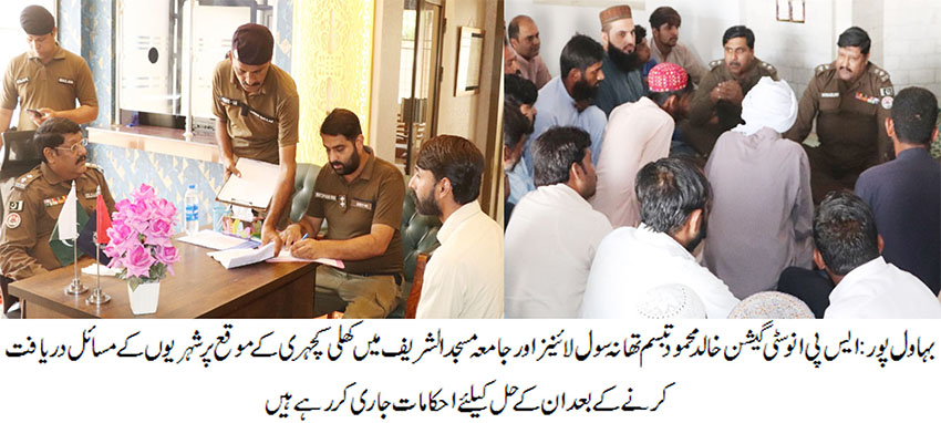 بہاول پور( )ایس پی انوسٹی گیشن خالد محمود تبسم کی جانب سے تھانہ سول لائینز اور جامعہ مسجدالشریف علاقہ تھانہ صدر بہاول پورمیں کھلی کچہری کا انعقاد کیا گیا۔ کھلی کچہری میں شہریوں کی بڑی تعداد کو سنا اور انفرادی طور پر متعلقہ افسران شہریوں کے مسائل بر وقت حل کرنے کے احکامات جاری کیے، کھلی کچہری کا مقصد بلاتاخیر شہریوں کے مسائل کو میرٹ پر حل کرنا اور گھر کی دہلیز پر انصاف فراہم کرنا ہے ،ایس پی انوسٹی گیشن خالد محمود تبسم