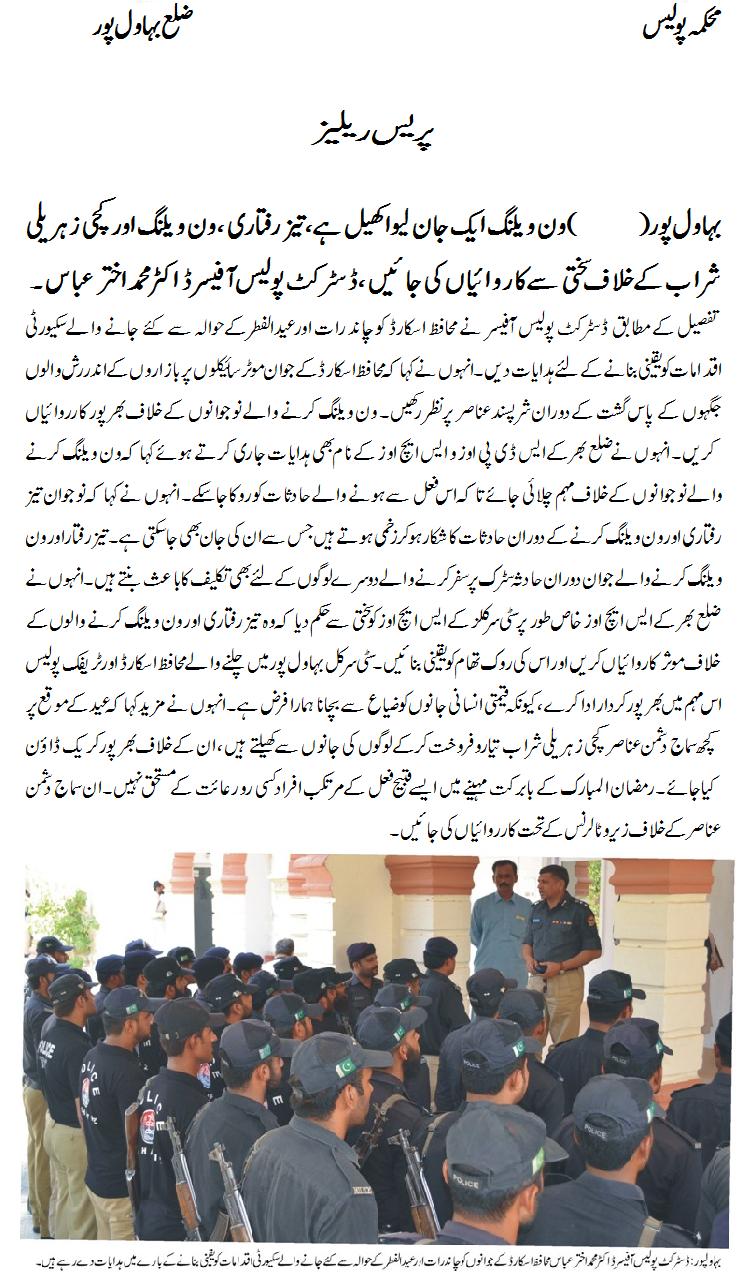 ون ویلنگ ایک جان لیوا کھیل ھے۔ تیز رفتاری ،ون ویلنگ اور کچی زہریلی شراب کے خلاف سختی سے کاروائیاں کی جائے ۔ڈسٹرکٹ پولیس آفیسر ڈاکٹر محمداختر عباس