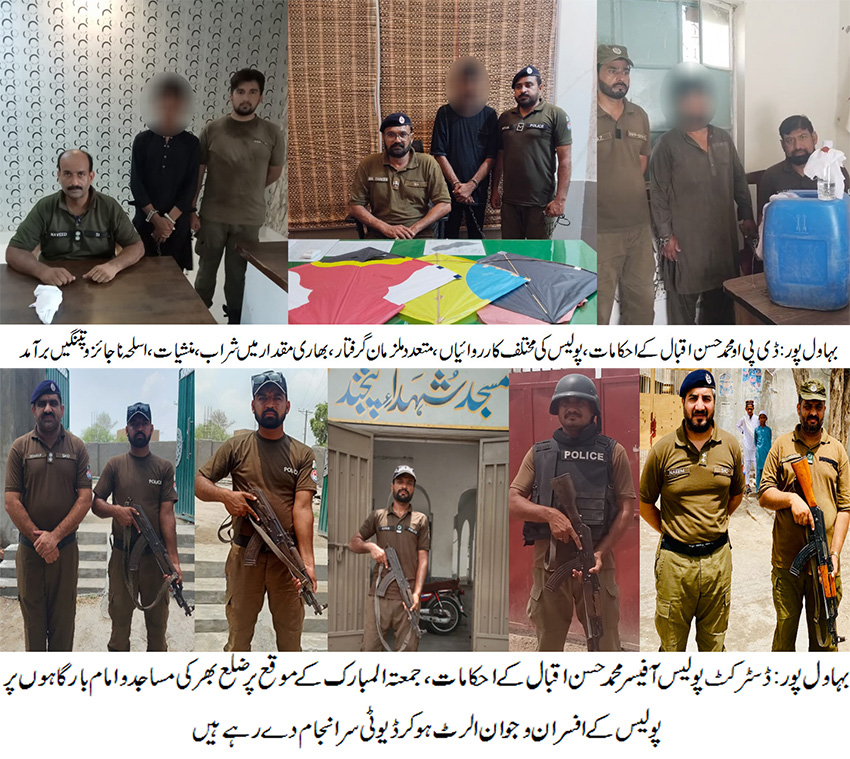 بہاول پور( )ڈسٹرکٹ پولیس آفیسرمحمد حسن اقبال کی زیر کمانڈ جرائم پیشہ افراد کے خلاف کارروائیاں جاری، گزشتہ روز کی مختلف کارروائیوں میں09ملزمان گرفتار۔بھاری مقدار میں شراب،منشیات، اسلحہ ناجائزاور پتنگیں برآمد۔جرائم پیشہ افراد کے خلاف جاری کارروائیوں کو مزید تیز کیا جارہا ہے ، ڈی پی اومحمد حسن اقبال