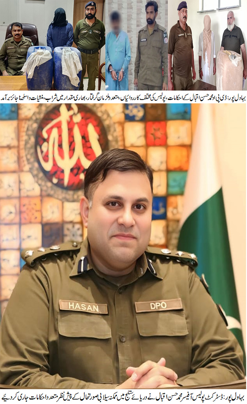 بہاول پور( )ڈسٹرکٹ پولیس آفیسرمحمد حسن اقبال کی زیر کمانڈ جرائم پیشہ افراد کے خلاف کارروائیاں جاری، گزشتہ روز کی مختلف کارروائیوں میں12ملزمان گرفتار۔بھاری مقدار میں شراب،منشیات اور اسلحہ ناجائز برآمد۔جرائم پیشہ افراد کے خلاف جاری کارروائیوں کو مزید تیز کیا جارہا ہے ، ڈی پی اومحمد حسن اقبال