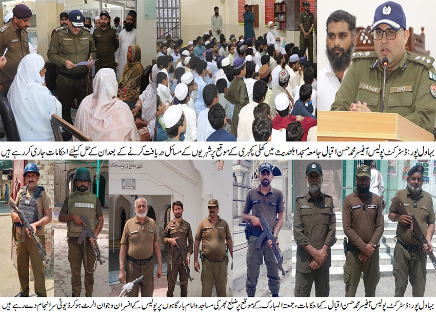 بہاول پور( )ڈسٹرکٹ پولیس آفیسر محمد حسن اقبال کے احکامات ، جمعتہ المبارک کے روز ایس ڈی پی اوز اور ایس ایچ اوز کے سکیورٹی کے حوالے سے مساجد اور امام بارگاہوں کے وزٹ، موجودہ ملکی صورتحال کے پیش نظر ڈیوٹی پر مامور اہلکاروں کو الرٹ رہنے کی ہدایت، سکیورٹی فرائض میں غفلت ہرگز برداشت نہیں کی جائے گی، ڈسٹرکٹ پولیس آفیسرمحمد حسن اقبال