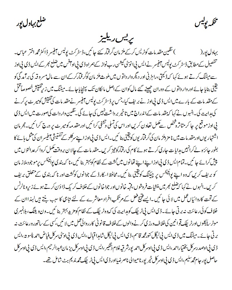 سنگین مقدمات کو ٹریس کر کے ملزمان گرفتار کیے جائیں ڈسٹرکٹ پولیس آفیسر ڈاکٹرمحمداختر عباس کی ایس پی اینوسٹی گیشن رب نواز کے ہمراہ ڈی پی او آفس میں ضلع بھر کے ایس ڈی پی اوز سے میٹینگ