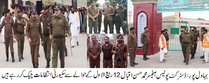 بہاول پور( )ڈسٹرکٹ پولیس آفیسر محمد حسن اقبال مرکزی عید گاہ میں 12ربیع الاول عید میلادالنبی ﷺ کے حوالے سے سکیورٹی انتظامات کا جائزہ لیا ، جلو س اور محافل میلاد کے پر امن انعقاد کے حوالے سے سکیورٹی کے سخت انتظامات کئے گئے ہیں ۔کسی کو امن خراب کرنے کی اجازت نہیں دے سکتے ، شرپسند عناصر پر کڑی نظر رکھی جارہی ہے، ڈی پی او محمد حسن اقبال