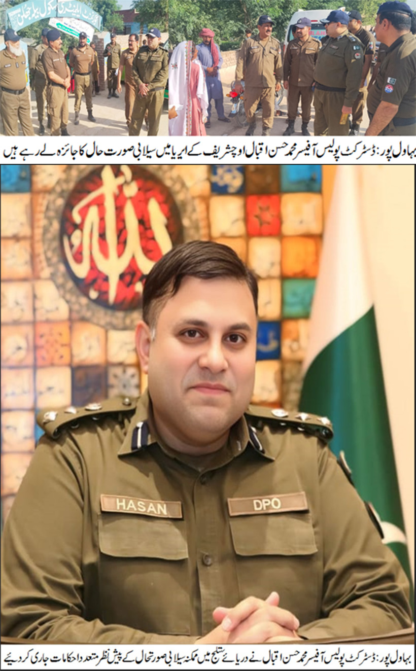 تفصیلات کے مطابق ڈسٹرکٹ پولیس آفیسر محمد حسن اقبال نے کہا کہ ا عوام الناس سے گزارش ہے کہ انتظامیہ سے مکمل تعاون کریں۔پانی کی صورتحال کے پیشِ نظر محتاط رہیں اور لازمی حفاظتی تدابیر اختیار کریں۔افواہوں اور جھوٹی خبروں سے گریز کریں۔ حقیقی معلومات کے لئے بہاولپور پولیس اور ضلعی انتظامیہ کے سوشل میڈیا اکانٹس دیکھتے رہیں تاکہ آپ صحیح معنوں میں باخبر رہیں۔انہوںنے مزید کہا کہ  بعض پرائیویٹ کشتیوں کے مالکان متاثرہ افراد کو پانی سے نکالنے یا محفوظ مقامات تک پہنچانے کے لیے ناجائز طور پر زیادہ کرایہ وصول کر رہے ہیں۔عوام الناس کو ہدایت کی جاتی ہے کہ اگر کسی کے ساتھ اس نوعیت کا واقعہ پیش آئے یا اس بارے میں کوئی اطلاع موصول ہو تو فوری طور پر 15 پر کال کریں، قریبی پولیس اسٹیشن، ریسکیو 1122 یا ضلعی انتظامیہ کے دفاتر کو اطلاع دیں تاکہ بروقت قانونی کارروائی عمل میں لائی جا سکے اور عوام کو استحصال سے محفوظ رکھا جا سکے۔عوام سے گزارش ہے کہ انتظامیہ کے ساتھ تعاون کریں اور کسی بھی شکایت یا اطلاع کی صورت میں تاخیر نہ کریں۔