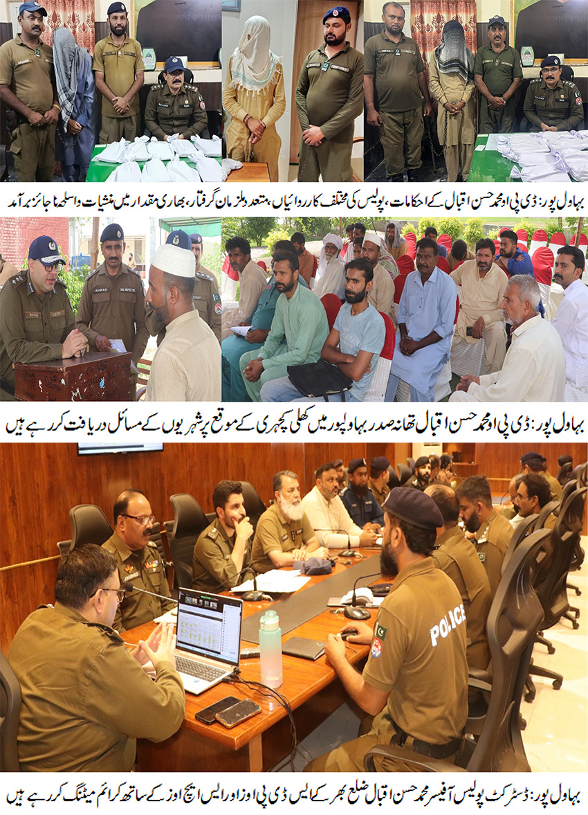 بہاول پور( )ڈسٹرکٹ پولیس آفیسر محمد حسن اقبال کی جانب سے تھانہ صدر بہاولپور میں کھلی کچہری کا انعقاد۔کھلی کچہری میںاہل علاقہ کی بڑی تعداد کو سنا اور انفرادی طور پر متعلقہ افسران کو شہریوں کے مسائل بر وقت حل کرنے کے احکامات جاری کیے، کھلی کچہری کا مقصد بلاتاخیر شہریوں کو گھر کی دہلیز پر انصاف کی فراہمی کو یقینی بنانا ہے،ڈی پی او محمد حسن اقبال