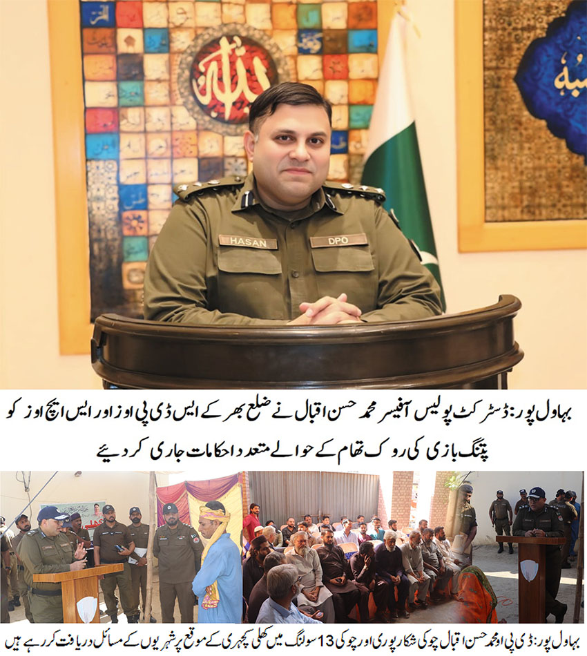 بہاول پور( )ڈسٹرکٹ پولیس آفیسر محمد حسن اقبال کا دو مقامات پر کھلی کچہری کا انعقاد۔ کھلی کچہری میںاہل علاقہ کی بڑی تعداد کو سنا اور افسران کو شہریوں کے مسائل بر وقت حل کرنے کے احکامات جاری کیے، کھلی کچہری کا مقصد بلاتاخیر شہریوں کے مسائل کو میرٹ پر حل کرنا اور گھر کی دہلیز پر انصاف کی فراہمی کو یقینی بنانا ہے،ڈی پی او محمد حسن اقبال