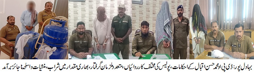 بہاول پور( )ڈسٹرکٹ پولیس آفیسرمحمد حسن اقبال کی کمانڈ میں بہاولپور پولیس کا سماج دشمن عناصر کے خلاف کریک ڈائون 10ملزمان گرفتار۔بھاری مقدار میں شراب، منشیات اور اسلحہ ناجائز برآمد۔جرائم پیشہ افراد کے خلاف جاری کارروائیوں کو مزید تیز کیا جارہا ہے ، ڈی پی اومحمد حسن اقبال