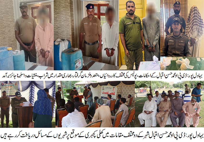 بہاول پور( )ڈسٹرکٹ پولیس آفیسر محمد حسن اقبال کا دو مقامات پر کھلی کچہری کا انعقاد۔ کھلی کچہری میںاہل علاقہ کی بڑی تعداد کو سنا اور افسران کو شہریوں کے مسائل بر وقت حل کرنے کے احکامات جاری کیے، کھلی کچہری کا مقصد بلاتاخیر شہریوں کے مسائل کو میرٹ پر حل کرنا اور گھر کی دہلیز پر انصاف کی فراہمی کو یقینی بنانا ہے،ڈی پی او محمد حسن اقبال
