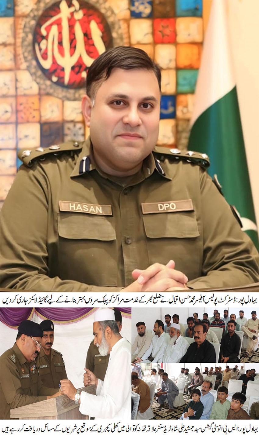 بہاول پور( )ڈسٹرکٹ پولیس آفیسر محمد حسن اقبال نے ضلع بھر کے خدمت مراکز کو پبلک سروس بہتر بنانے کے لیے گائیڈ لائنز جاری کردیں، خدمت مراکز کی آن لائن مانیٹرنگ کو ہر صور ت یقینی بنایا جائے، خدمت مراکز بہاول پورپولیس کا FACE ہیں، جن میں بدعنوانی اور شہریوں سے بداخلاقی کسی صورت قابل برداشت نہیں ہے تمام افسران اپنا قبلہ درست رکھیں، ڈی پی او