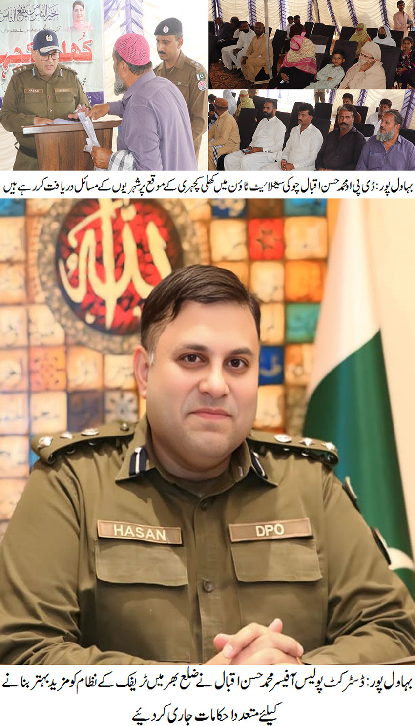 تفصیل کے مطابق انسپکٹر جنرل آف پولیس پنجاب کے ویژن انصاف آپ کی دہلیز پر کے پیش نظر ڈی پی اومحمد حسن اقبال نے چوکی سیٹلائیٹ ٹائون تھانہ بغداد الجدید میں کھلی کچہری لگائی، جس میں اہل علاقہ کی کثیر تعداد نے شرکت کی۔ ڈی پی او کے ہمراہ ایس ڈی پی او سٹی سرکل، ایس ایچ اوتھانہ بغداد الجدید ودیگر معزز شخصیات نے بھی شرکت کی۔ڈی پی او محمد حسن اقبال نے کھلی کچہری میں تمام سائلین کو تفصیل سے سنا اور انفرادی طور پر متعلقہ افسران کو بروقت قانونی کارروائی اور واپسی رپورٹ کے احکامات جاری کیے۔ ڈی پی او نے کھلی کچہری میں شہریوں سے بات کرتے ہوئے کہا کہ تھانوں میں کھلی کچہری کا انقعاد ہماری اولین ترجیح ہے تاکہ شہریوں کے مسائل سن کر ان کی دہلیز پر بروقت دادرسی کی جاسکے۔ڈی پی اونے دوران کھلی کچہری افسران کو ہدایات جاری کرتے ہوئے کہاکہ میرٹ کو مقدم رکھتے ہوئے شہریوں کے مسائل تھانہ کی سطح پر ہی حل کیے جائیں جوکہ ہماری اولین ذمہ داری ہے۔ کھلی کچہری کا مقصد عوام کے مسائل کو ترجیحی بنیادوں پر حل کرنا اور عوام اور پولیس کے مابین فاصلے مٹانا ہے ۔ ایس ایچ اوز کو ہدایات جاری کرتے ہوئے کہا کہ عوام الناس کے ساتھ بہتر رویہ اپنائیں۔ عوام کی خدمت اور ان کے جان و مال کا تحفظ ہر صور ت یقینی بنایا جائے۔جبکہ شہریوں کا کہنا تھا کہ ہم بہت مطمئن ہیں کہ ڈسٹرکٹ پولیس آفیسر خود ہمارے مسائل کے حل کے لئے تشریف لائے اور مسائل کو فوری حل کرنے کے متعلق افسران کو حکم جاری کئے۔ ڈی پی او بہاولپور کے اس احسن اقدام سے انصاف کا بول بالا ہو رہا ہے۔ آخر میں ڈی پی او محمد حسن اقبال نے شہریوں کی شرکت پر بھی ان کا شکریہ ادا کیا۔