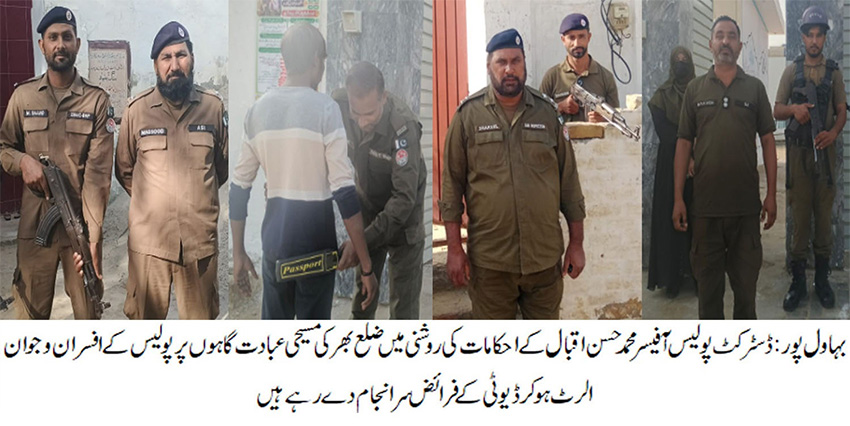 بہاو ل پور( )ڈسٹرکٹ پولیس آفیسر محمد حسن اقبال کے احکامات کی روشنی میں مسیحی عبادت گاہوں کی سکیورٹی کے سخت انتظامات، سینکڑوں پولیس افسران و اہلکار ڈیوٹی پر تعینات، مسیحی برادری سمیت تمام شہریوں کی حفاظت ہمارے اولین فرائض میں شامل ہے، ڈی پی او محمد حسن اقبال