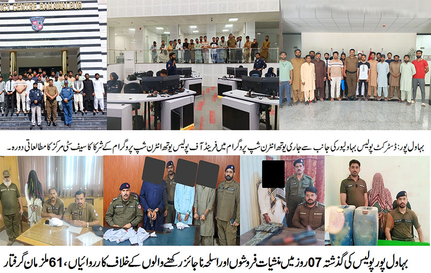 بہاول پور( )پولیس کی گذشتہ07روزمیں منشیات فروشوںاوراسلحہ ناجائزرکھنے والوں کے خلاف کارروائیاں،61ملزمان گرفتار، ملزمان کے قبضہ سے 10پسٹل 30بور، 02 کاربین، 02رپیٹر 12بور 01 کلاشنکوف ،20کلوگرام سے زائد چرس ،2100 گرام ہیروئن،1790گرام کرسٹل آئس،815 لیٹر شراب،170 لیٹر لہن اور02عددچالوبھٹیاںبرآمد ،مقدمات درج۔منشیات فروشی میں ملوث ملزمان کو جیل کی سلاخوں کے پیچھے پہنچایا جا رہاہے ،بہاول پورکو منشیات سے ہرصورت پاک کیا جائے گا۔ڈی پی او محمد حسن اقبال