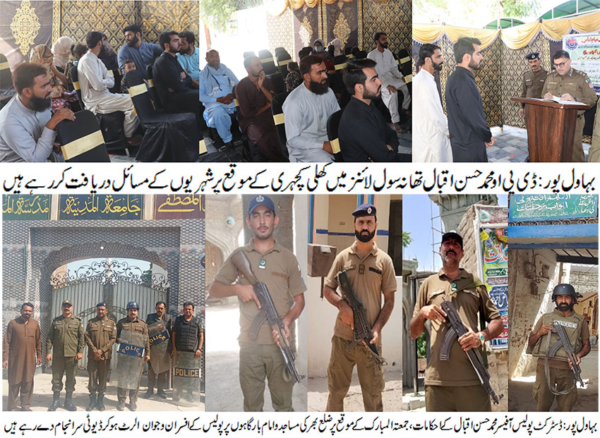 بہاول پور( )ڈسٹرکٹ پولیس آفیسر محمد حسن اقبال کے احکامات ، جمعتہ المبارک کے روز ایس ڈی پی اوز اور ایس ایچ اوز کے سکیورٹی کے حوالے سے مساجد اور امام بارگاہوں کے وزٹ، موجودہ ملکی صورتحال کے پیش نظر ڈیوٹی پر مامور اہلکاروں کو الرٹ رہنے کی ہدایت، سکیورٹی فرائض میں غفلت ہرگز برداشت نہیں کی جائے گی، ڈسٹرکٹ پولیس آفیسرمحمد حسن اقبال