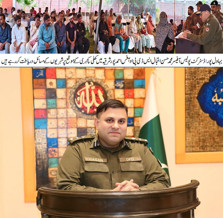 بہاول پور( )ڈسٹرکٹ پولیس آفیسر محمد حسن اقبال کی جانب سے ایس ڈی پی او آفس سرکل احمد پور شرقیہ میں کھلی کچہری کا انعقاد کیا گیا۔ کھلی کچہری میںاہل علاقہ کی بڑی تعداد کو سنا اور انفرادی طور پر متعلقہ افسران کو شہریوں کے مسائل بر وقت حل کرنے کے احکامات جاری کیے، کھلی کچہری کا مقصد بلاتاخیر شہریوں کے مسائل کو میرٹ پر حل کرنا اور گھر کی دہلیز پر انصاف کی فراہمی کو یقینی بنانا ہے،ڈی پی او محمد حسن اقبال