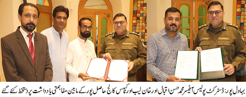 بہاولپور( )ڈسٹرکٹ پولیس آفیسر محمد حسن اقبال کا بہاولپور پولیس کے افسران و جوانوں خصوصاً پولیس کے شہداء کی فیملیز کی ویلفیئر کیلئے احسن اقدام،بہاولپورپولیس اورخان لیب اورکیپس(KIPS) کالج حاصل پورکے مابین مفاہمتی یادداشت پر دستخط۔پولیس افسران و جوانوں کی ویلفیئر بہاولپور پولیس کی اولین ترجیحات میں شامل ہے، ڈی پی او محمد حسن اقبال