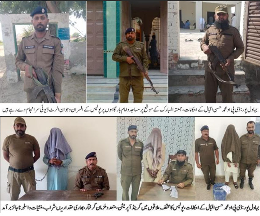 بہاول پور( )ڈسٹرکٹ پولیس آفیسرمحمد حسن اقبال کی کمانڈ میں بہاولپور پولیس کا سماج دشمن عناصر کے خلاف گرینڈ آپریشن، مختلف کارروائیوں میں09 ملزمان گرفتار۔ شراب،منشیات اور اسلحہ ناجائز برآمد۔جرائم پیشہ افراد کے خلاف جاری کارروائیوں کو مزید تیز کیا جارہا ہے ، ڈی پی اومحمد حسن اقبال