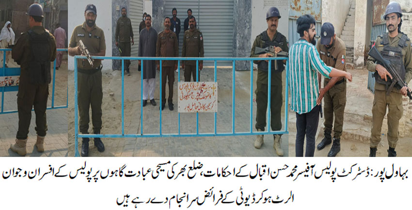 بہاو ل پور( )ڈسٹرکٹ پولیس آفیسر محمد حسن اقبال کے احکامات کی روشنی میں مسیحی عبادت گاہوں کی سکیورٹی کے سخت انتظامات، سینکڑوں پولیس افسران و اہلکار ڈیوٹی پر تعینات، مسیحی برادری سمیت تمام شہریوں کی حفاظت ہمارے اولین فرائض میں شامل ہے، ڈی پی او محمد حسن اقبال