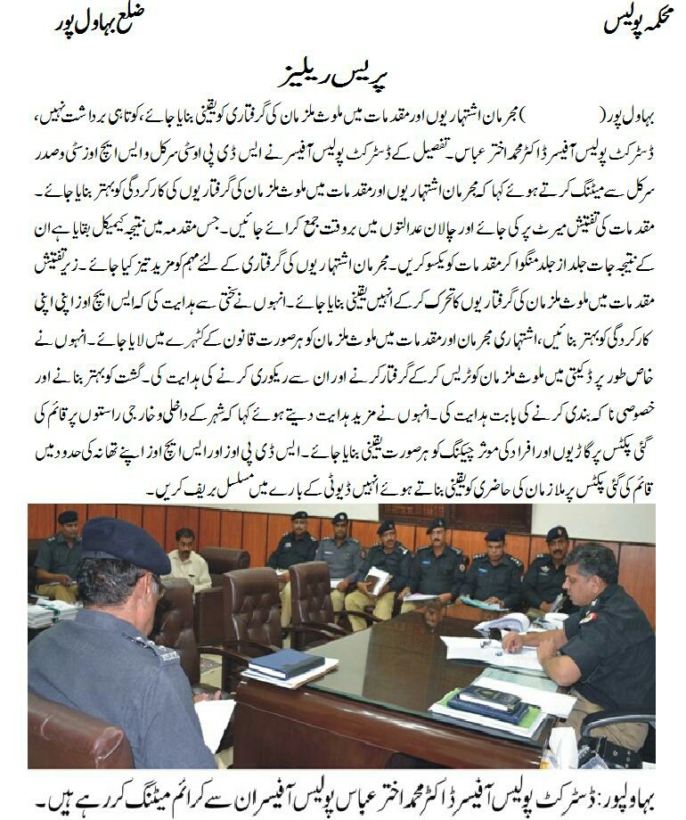 مجرمان اشتہاریوں اور مقدمات میں ملوث ملزمان کی گرفتاری یقینی بنایا جاۓ کوتاہی برداشت نہیں ۔ ڈاکٹر محمداختر عباس