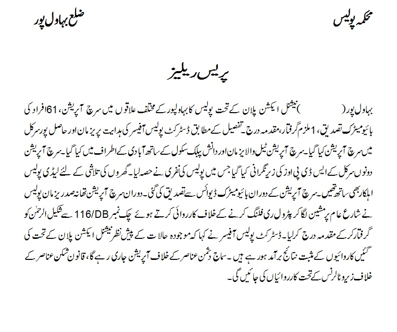 نیشنل ایکشن پلان کے تحت بہاولپور پولیس کا مختلف علاقوں میں سرچ آپریشن ،61 زائد افراد کا بذریعہ بائومیٹریک ڈیوائس سے تصدیق