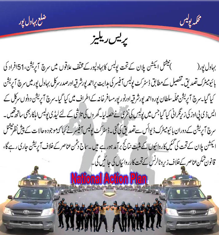 ﻧﯿﺸﻨﻞ ﺍﯾﮑﺸﻦ ﭘﻼﻥ ﮐﮯ ﺗﺤﺖ ﭘﻮﻟﯿﺲ ﮐﺎ مختلف علاقوں میں سرچ آپریشن ،ﻧﯿﺸﻨﻞ ﺍﯾﮑﺸﻦ ﭘﻼﻥ ﮐﮯ ﺗﺤﺖ ﭘﻮﻟﯿﺲ ﮐﺎ ﺳﺮﭺ ﺁﭘﺮﯾﺸﻦ 51 افراد کا بذریعہ بائومیٹریک ڈیوائس سے تصدیق