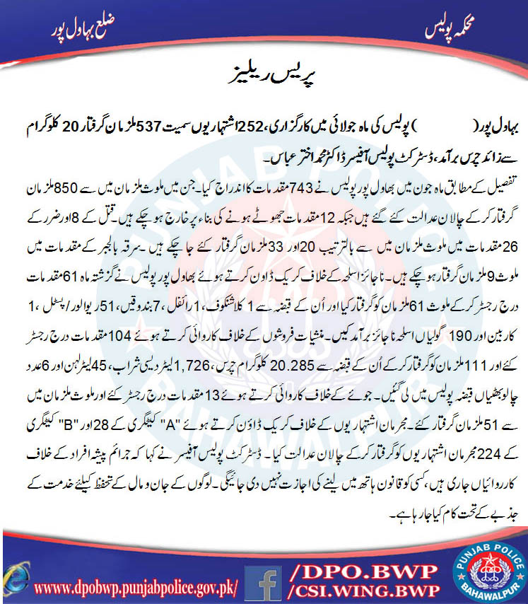 پولیس کی ماہِ جون میں کرگزاری، 252 اشتہاریوں سمیت 537 ملزمان گرفتار ، 20 کلوگرام سے زائد چرس برآمد