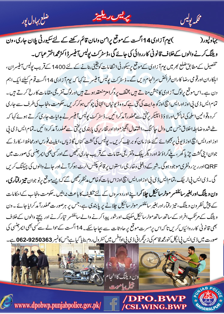 ۔یومِ آزاری 14اگست کے موقع پرامن وامان قائم رکھنے کے لیے سکیورٹی پلان جاری، ون ویلنگ کرنے والوں کے خلاف کاروائی کی جاۓ گی، ڈسٹرکٹ پولیس آفیس ڈاکٹر محمد اختر عباس