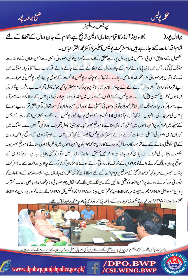 لاء اینڈ آرڈر کا قیام ھماری اوّلین ترجیح ھے، عوام کی جان و مال کے تحفظ کے لیے تمام اقدامات کیے جارہے ہیں۔ڈسٹرکٹ پولیس آفیسر ڈاکٹر محمد اختر عباس