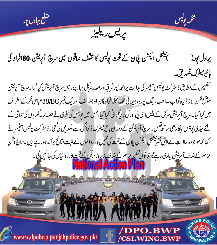 نیشنل ایکشن پلان کے تحت بہاولپور پولیس کا مختلف علاقوں میں سرچ آپریشن ، 80 افراد کا بذریعہ بائومیٹریک ڈیوائس سے تصدیق