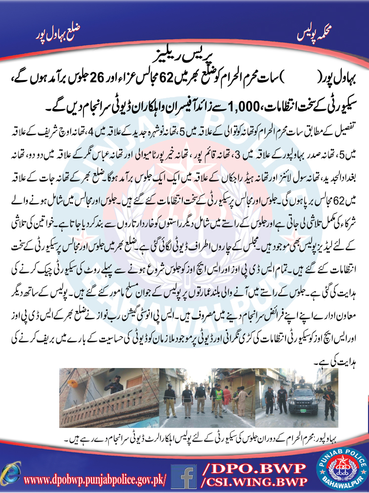 سات محرم الحرام کو ضلع بھر میں 62 مجالس عزا اور 26 جلوس برآمد ہونگے، سکیورٹی کے سخت انتظامات 1,000 سےزائد آفیسران و اہلکاران ڈیوٹی سر انجام دیں گے