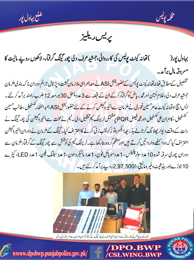 تھانہ کینٹ پولیس کی کاروائی، جمشید عرف دلی چور گینگ گرفتار ، لاکھوں روپے مالیت کا مسروقہ سامان برآمدت