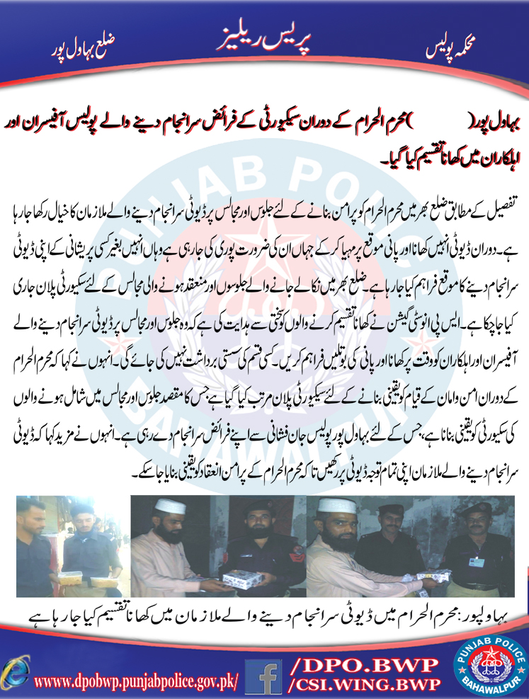 محرم الحرام کے دوران سکیورٹی کے فرائض سر انجام دینے والے پولیس آفیسران اور اہلکاران میں کھانا تقسيم کیا گیا۔