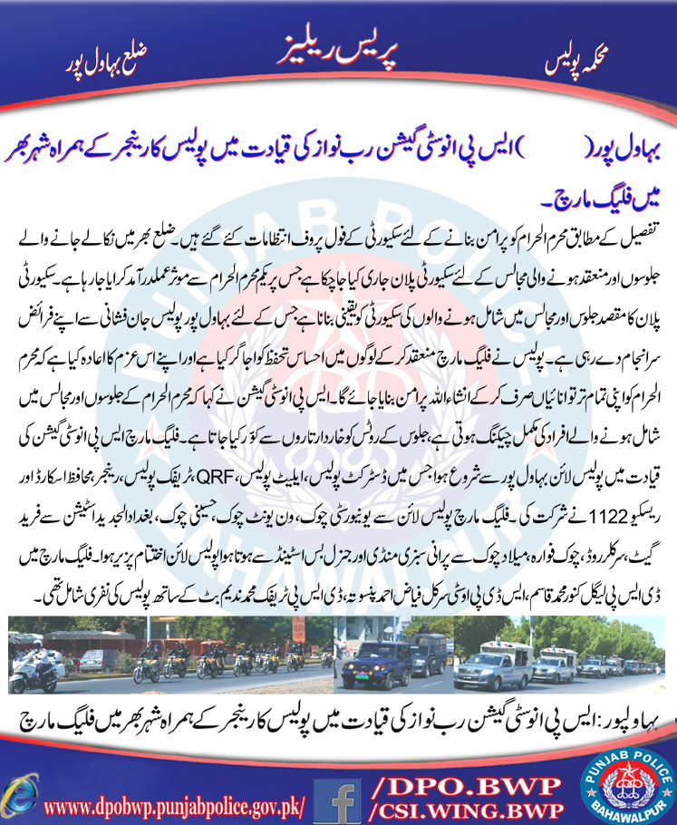 ایس پی اینوسٹی گیشن رب نواز کی قیادت میں پولیس کارینجرز کے ہمراہ شہر بھر میں فلیگ مارچ