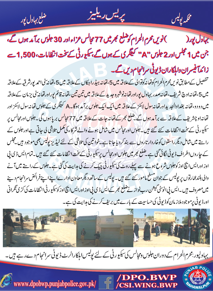 نویں محرم الحرام کو ضلع بھر میں 77 مجالس اور 30 جلوس برآمد ہونگے جن میں ایک مجلس اور 2 جلوس اے کیٹیگری کے ہونگے، سکیورٹی کے سخت انتظامات