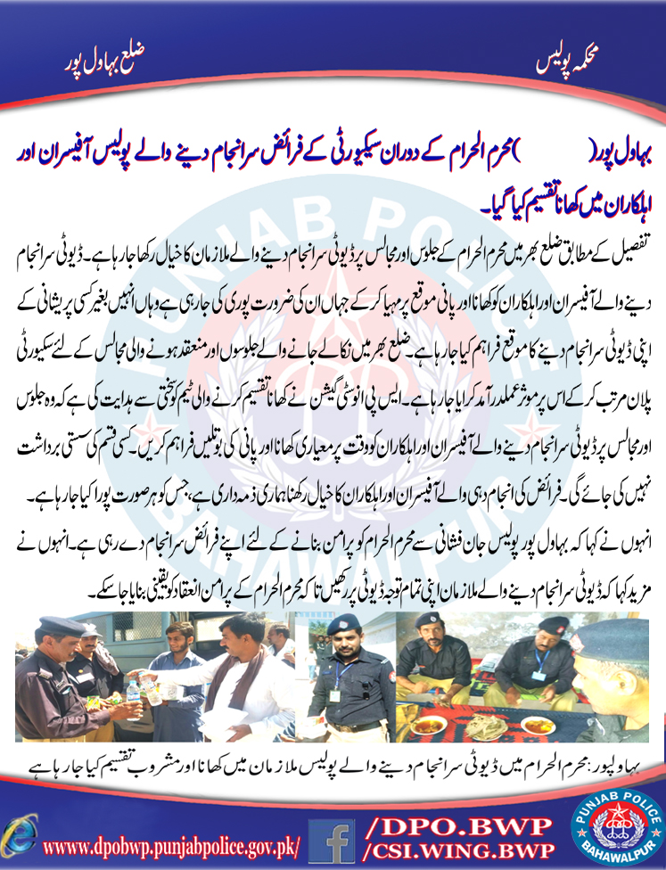 محرم الحرام کے دوران سکیورٹی کے فرائض سر انجام دینے والے پولیس آفیسران اور اہلکاران میں کھانا تقسيم کیا گیا۔