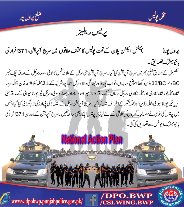 نیشنل ایکشن پلان کے تحت بہاولپور پولیس کا مختلف علاقوں میں سرچ آپریشن ، 371افراد کا بذریعہ بائومیٹریک ڈیوائس سے تصدیق