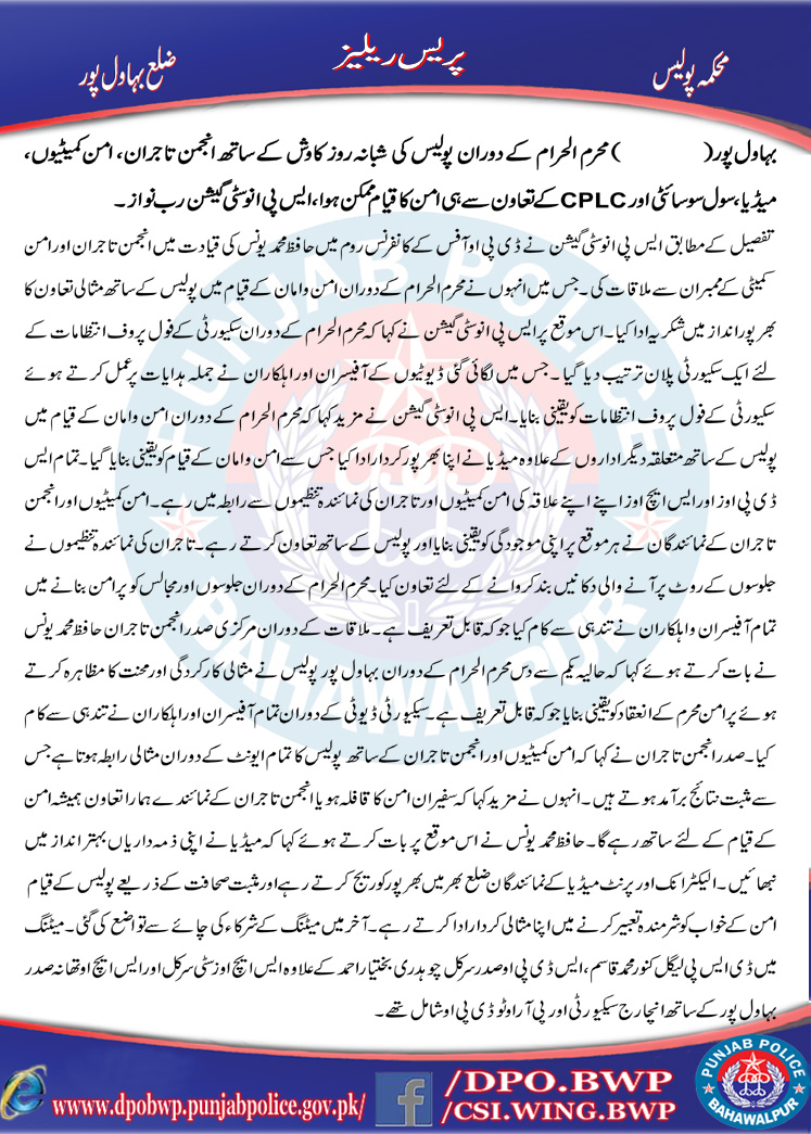 محرم الحرام کے دوران پولیس کی شانہ روز کاوش کے ساتھ انجمنِ تاجران، امن کمیٹیوں ، میڈیا ، سول سوسائٹی اور CPLC بہاولپور کے تعاون سے ہی امن کا قیام ممکن ھوا۔ ایس پی اینوسٹی گیشن رب نواز