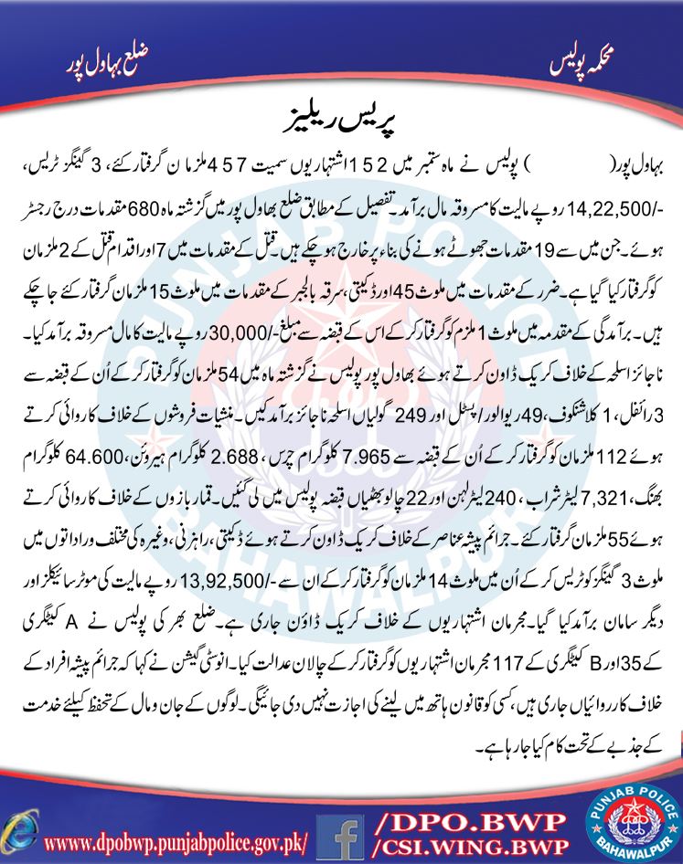 پولیس نے ماہِ ستمبر میں 152 اشتہاریوں سمیت 457 ملزمان گرفتار کیے ، 3 کریمنل گیگز ٹریس ،لاکھوں روپے مالیت کا مسروقہ سامان برآمد