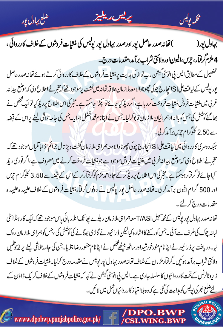 تھانہ صدر حاصلپور اور صدر بہاولپور کی منشیات فروشوں کےخلاف کاروائی ، 4ملزمان گرفتار ، چرس ، افیون اور ولائتی شراب برآمد ، مقدمات درج