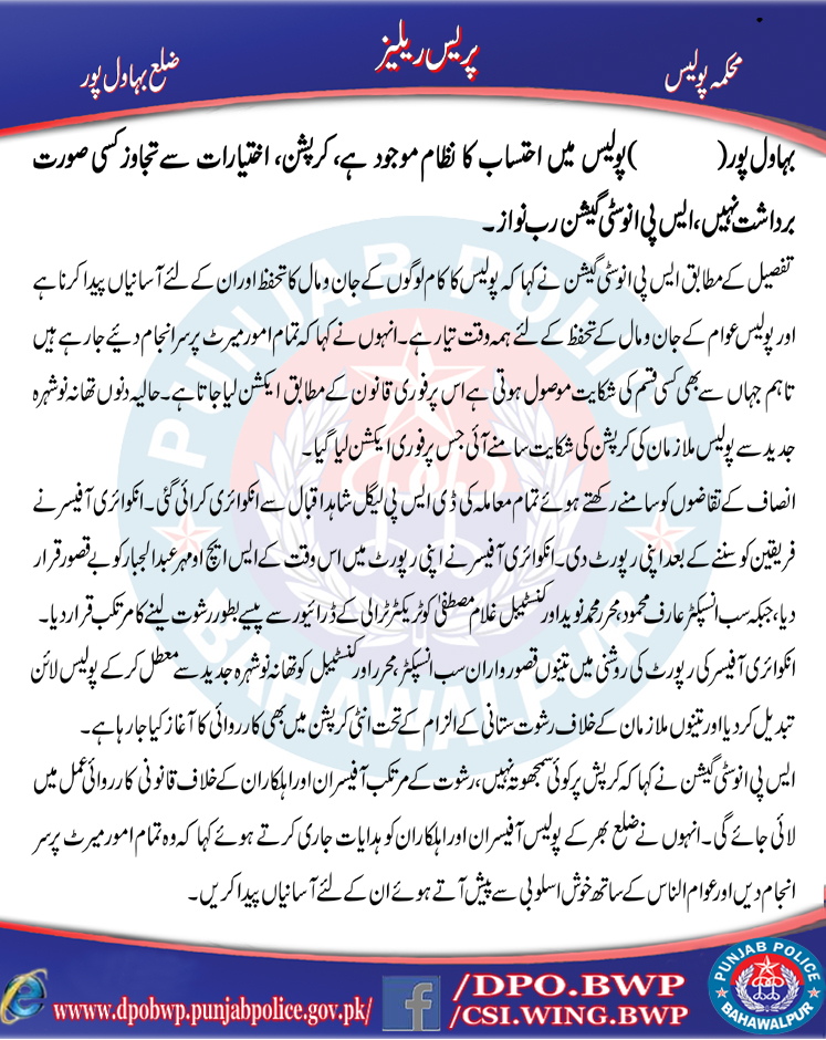 پولیس میں احتساب کا نظام موجود ھے، کرپشن، اختيارات سے تجاوز کسی صورت برداشت نہیں ۔ ایس پی اینوسٹی گیشن رب نواز۔ ۔