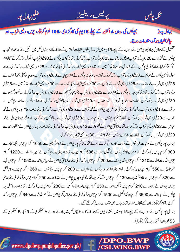 بہاولپور پولیس کی رواں ماہ اکتوبر کے پہلے 15 یوم کی کارگزاری، 106 ملزم گرفتار ، چرس، دیسی شراب اور چال بھٹیاں برآمد ، مقدمات درج