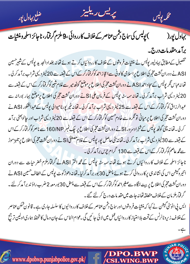 بہاولپور پولیس کی سماج دشمن عناصر کے خلاف کاروائی ، 9ملزم گرفتار ، ناجائز اسلحہ منشیات برآمد ،مقدمہ درج