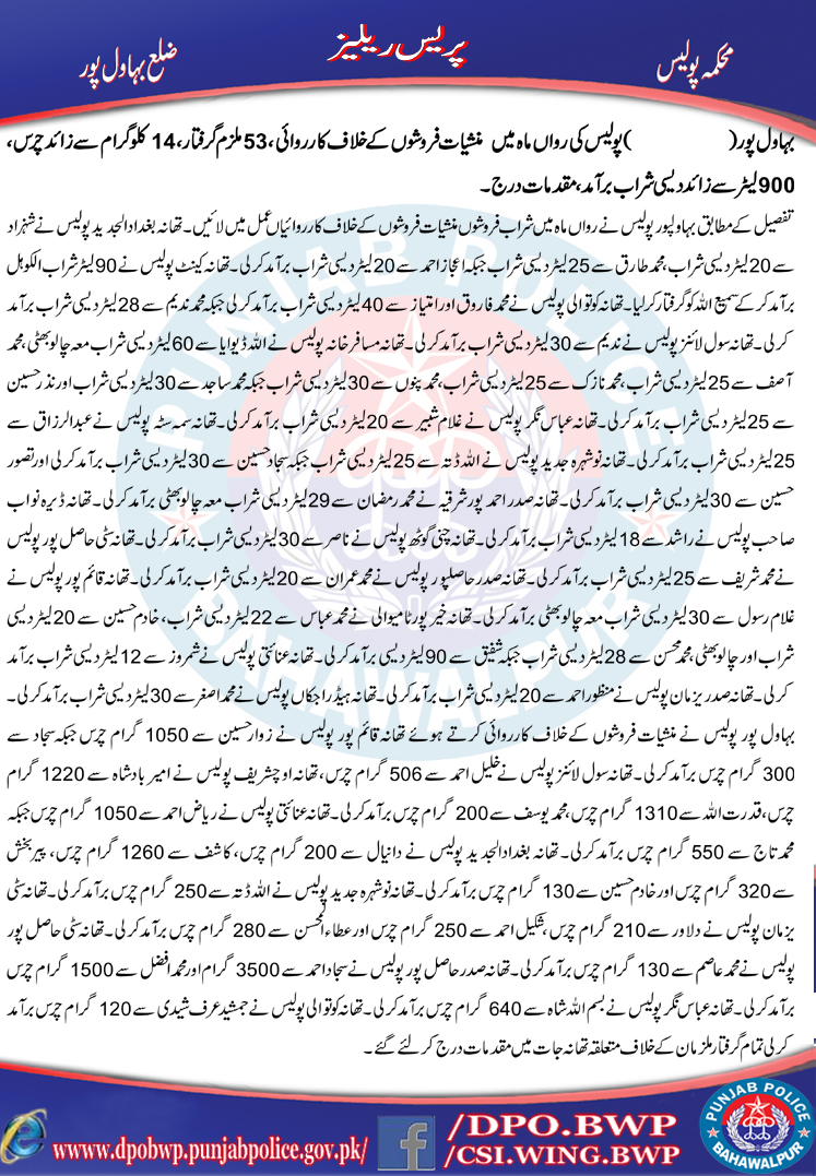 بہاولپور پولیس کی رواں ماہ میں منشیات فروشوں کےخلاف کاروائی ،53ملزم گرفتار ،14کلوگرام سے زائده چرس، 900 لیٹر سے زائد دیسی شراب برآمد ،مقدمات درج