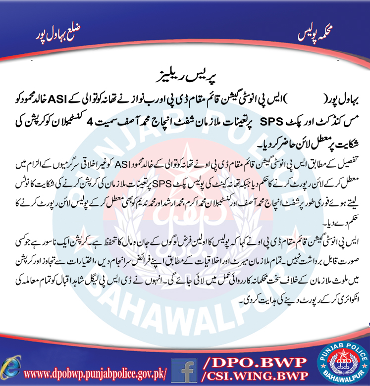 ایس پی اینوسٹی گیشن قائم مقام ڈی پی او رب نواز نے تھانہ کوتوالی کے اے ایس آئی خالد محمود کو مس کنڈکٹ اورپکٹ ایس پی ایس پر تعینات ملازمان شفٹ انچارج محمد آصف سمیت 4 کنسٹیبلان کو کرپشن کی شکایت پر معطل لائن حاضر کر دیا۔