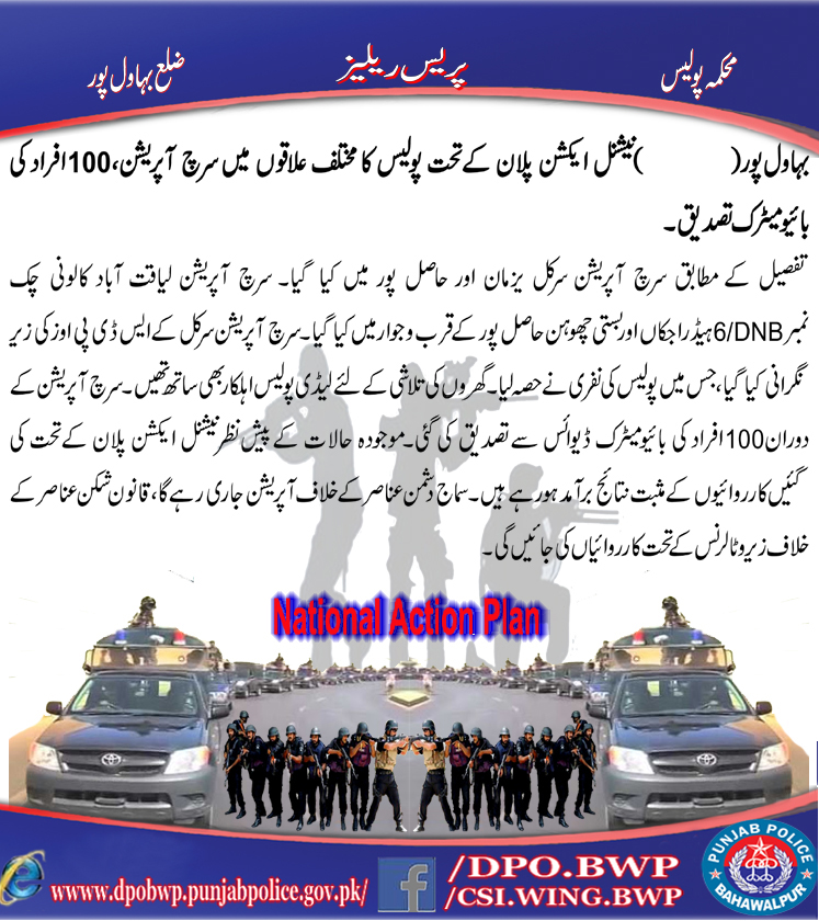 نیشنل ایکشن پلان کے تحت بہاولپور پولیس کا مختلف علاقوں میں سرچ آپریشن ، 100افراد کا بذریعہ بائومیٹریک ڈیوائس سے تصدیق