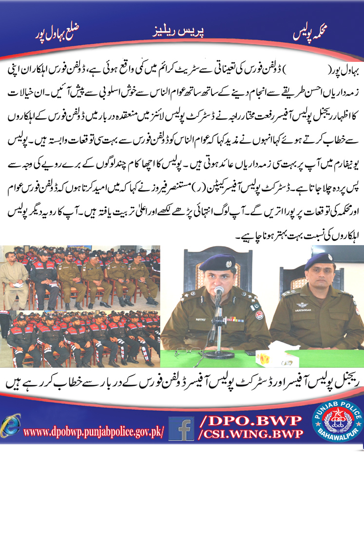 ڈولفن فورس کی تعیناتی سے اسٹریٹ کرائم میں کمی واقع ہوئی ھے ڈولفن فورس اہلکاران اپنی ذمداریاں احسن طریقے سے انجام دینے کے ساتھ عوام الناس سے خوش اسلوبی سے پیش آئیں ۔ریجنل پولیس آفیسر بہاولپور رفعت مختار راجہ۔ .